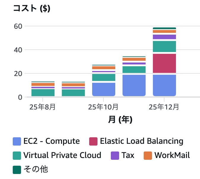 上の画像の12月の赤い部分Elastic Load BalancingがALBの費用と思われます。ちょうどGoogle Search Consoleに登録をしたので、クローラーがアクセスしに来ているのが原因かと思います。正直、EC2をスケールアップしたのでEC2の費用ばかり気にしていてALB(アプリケーションロードバランサー)はノーマークでした。。しかし、全体の30%くらいここで使ってる…。大体20$弱。日本円にして月額3,000円程度アップ。「おい!こりゃ上がりすぎだろ!」