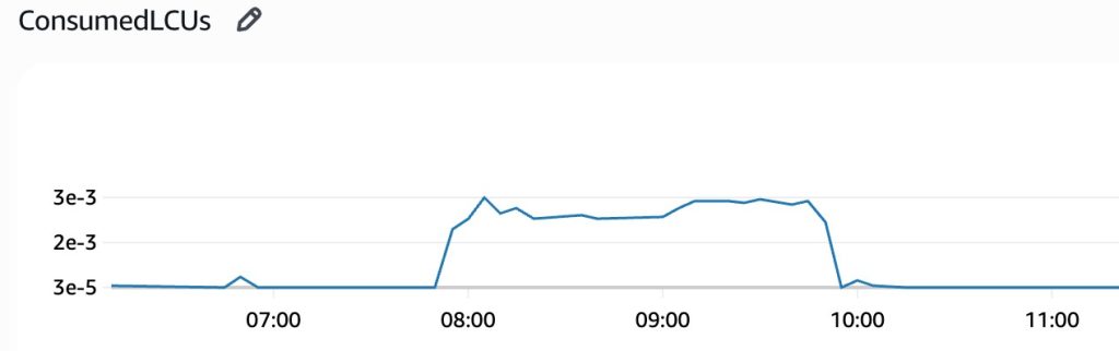RequestCountのグラフを見ると、8時から10時までの間は1秒間に1回程度のアクセス。それ以外の時間も1秒間に0.2回程度のアクセスがある模様。そして8時から10時はLCUが跳ね上がり、CloudWatchの棒グラフが綺麗な台形になっています。