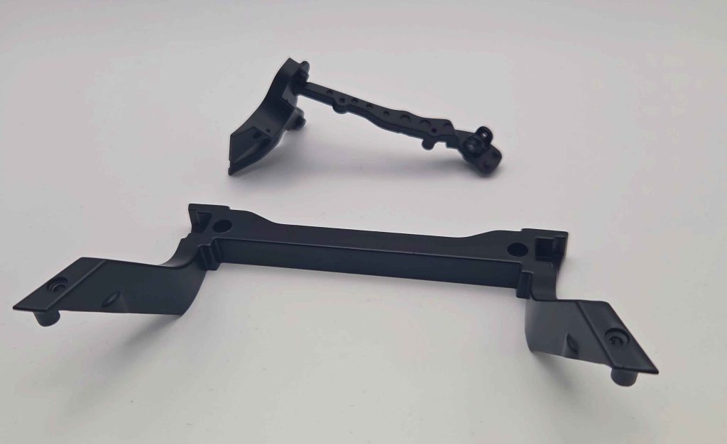 手前が今号に付いてきた、リアサポートフレームです。ここにサスペンションを取り付けて行くことになるでしょう。そして後ろが今回ちょっとだけ組み立てたリアサスのアームです。ほぼ組み立てがないので、なんかしょぼいですね・・。