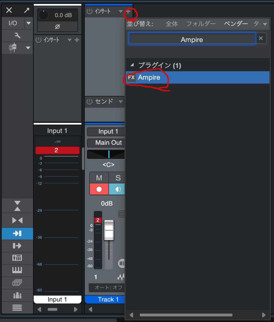 - ギターのトラックにあるインサートの「+」ボタンを押す。
