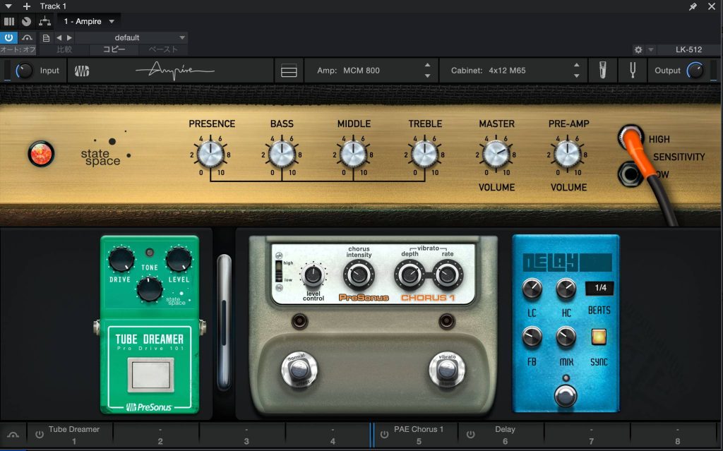 - Ampireを入れてプリセットを選ぶと一気にエレキギターっぽい音になる